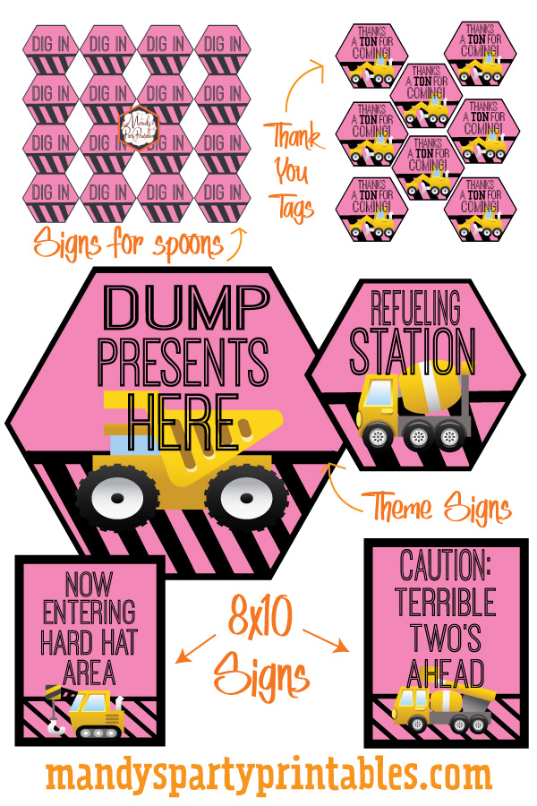 I have a Girly Happy Birthday Construction Banner and a Girly Party Sign for FREE download and print. I also have the full collection of girly construction party printables in my Etsy shop. You can see everything available here. Happy party planning!!