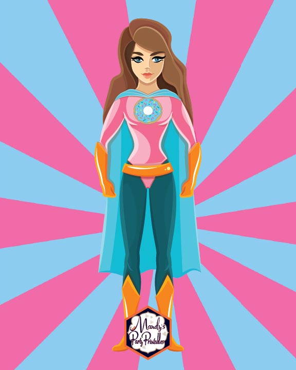 Superheroes are a big thing. With the Avengers, Fantastic Four, and the Justice Society of America, everyone needs a superhero to look up to. Enter my favorite super: she’s all about donuts and sprinkles are her superpower. As part of an upcoming party collection, I am giving you first look (and free download) at my sprinkle-wielding, donut superhero with this free printable!
