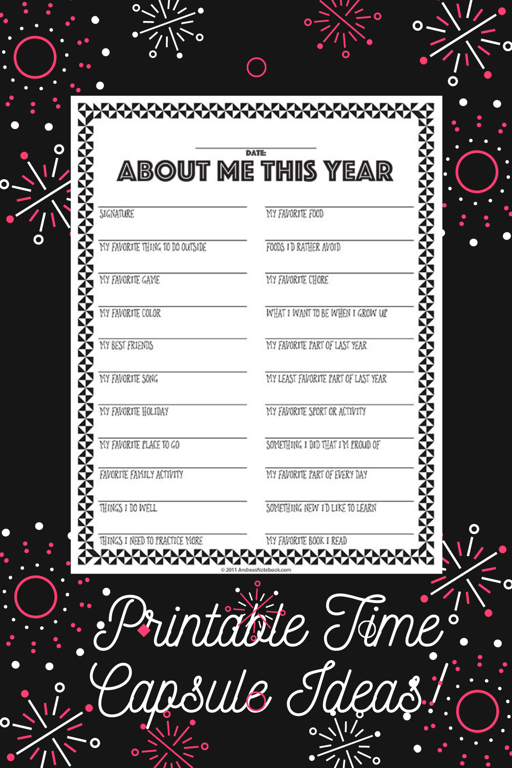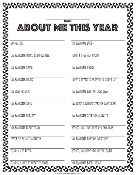 This modern time capsule printable questionnaire from Uncommon Designs Online even has a question about what your favorite app is. Don’t worry though, your favorite book is also asked 😉