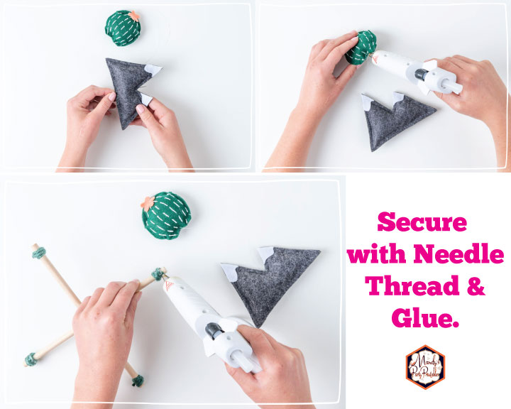 Step 8: With a needle and thread, string through each item and secure to the “T” using hot glue