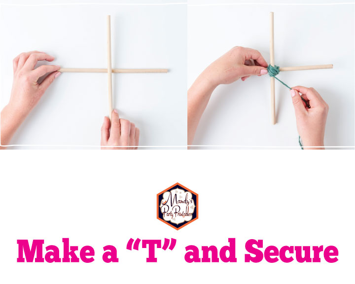 Step 7: Using two dowels, make a “T” and secure with yarn