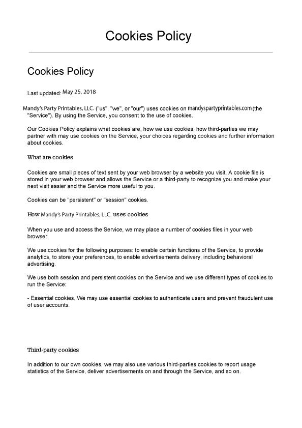 We allow 3rd party companies to collect certain anonymous information and/or serve ads when you visit Mandy’s Party Printables Web site. These companies may use non-personally identifiable information (e.g. click stream information, time and date, browser type, subject of advertisements scrolled over or clicked) during your visits to this site and other Web sites in order to provide advertisements about services and goods likely to be of greater interest to you. These companies typically use a 3rd party web beacon or cookie to collect this information. To learn more about this behavioral advertising practice visit the NAI athttp://www.networkadvertising.org. To opt-out of this type of advertising, you can visit http://www.aboutads.info/choices.